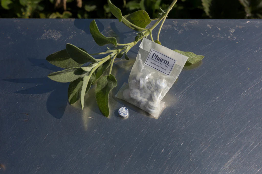 Deze kruidenpastilles bevatten gedistilleerde salie- en lavendelextracten van kruiden geteeld op onze boerderij en gedistilleerd in ons atelier om het natuurlijke aroma en de smaak te behouden.